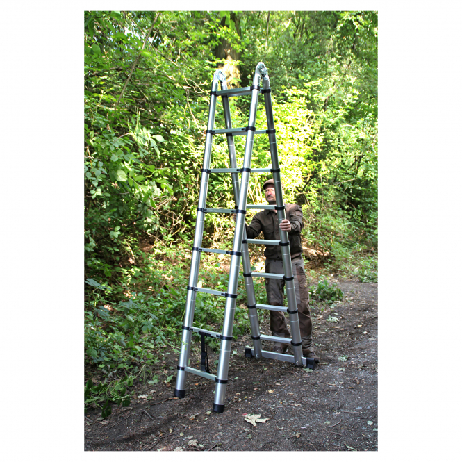Die Tele–Revierleiter ist multifunktionell einsetzbar. Diese Revierleiter verfügt als klappbare Teleskopleiter eine maximale Arbeitshöhe von 5 m oder aber 2.50 m bei geklapptem Einsatz. Durch die Teleskopfunktion lässt sich diese Leiter platzsparend verstauen. Verstärkte Glieder geben einen sicheren Halt. Eine angenehm eingestellte Tritthöhe ist auch bei dauerndem Auf- sowie Abstieg angenehm. Egal ob im Revier beim Freischneiden der Kanzel oder der jährlichen Pflege der Bäume, diese Tele–Leiter sollte bei keinen Arbeiten im Revier fehlen. Die Teleskopleiter besteht aus einer leichten, aber hochwertigen Aluminiumlegierung und wiegt nur 17 kg. Transportmaß: 92 x 67 x 17 cm. Max. Belastbarkeit: 150 kg. Anzahl der Strossen: 8+8.
